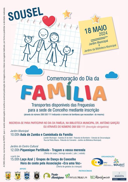 Assinala-se no próximo dia 15 de maio, o Dia da Família e no dia 18 de maio a CPCJ de Sousel e o Município de Sousel, com o apoio das Juntas de Freguesia do Concelho e das Empresas que se quiseram associar à iniciativa, convidam-no a comemorar este dia e a partilhar atividades em Família.